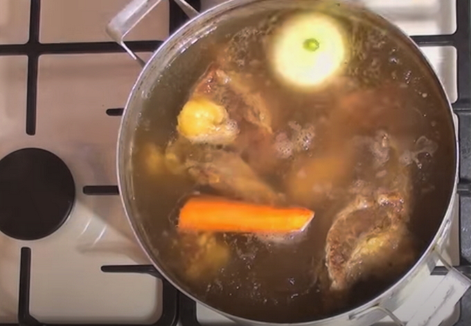 - Terwijl het vlees afkoelt, verwijdert u de uien en wortels uit de resulterende bouillon en verwijdert u ook het vet dat op het wateroppervlak is verschenen.