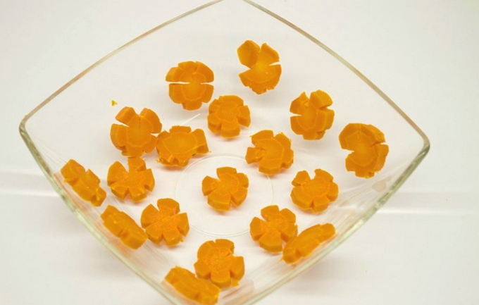 - Maak schattige uitsnijdingen (bloemen, sterren) van gekookte wortelen en leg ze op het vlees. Vul de vormen tot de bovenkant met afgekoelde bouillon en stuur ze een nacht naar de koelkast, denk eraan de vormen af te dekken met huishoudfolie. Verwijder voor het serveren het geleivlees voorzichtig door de vorm om te draaien.
