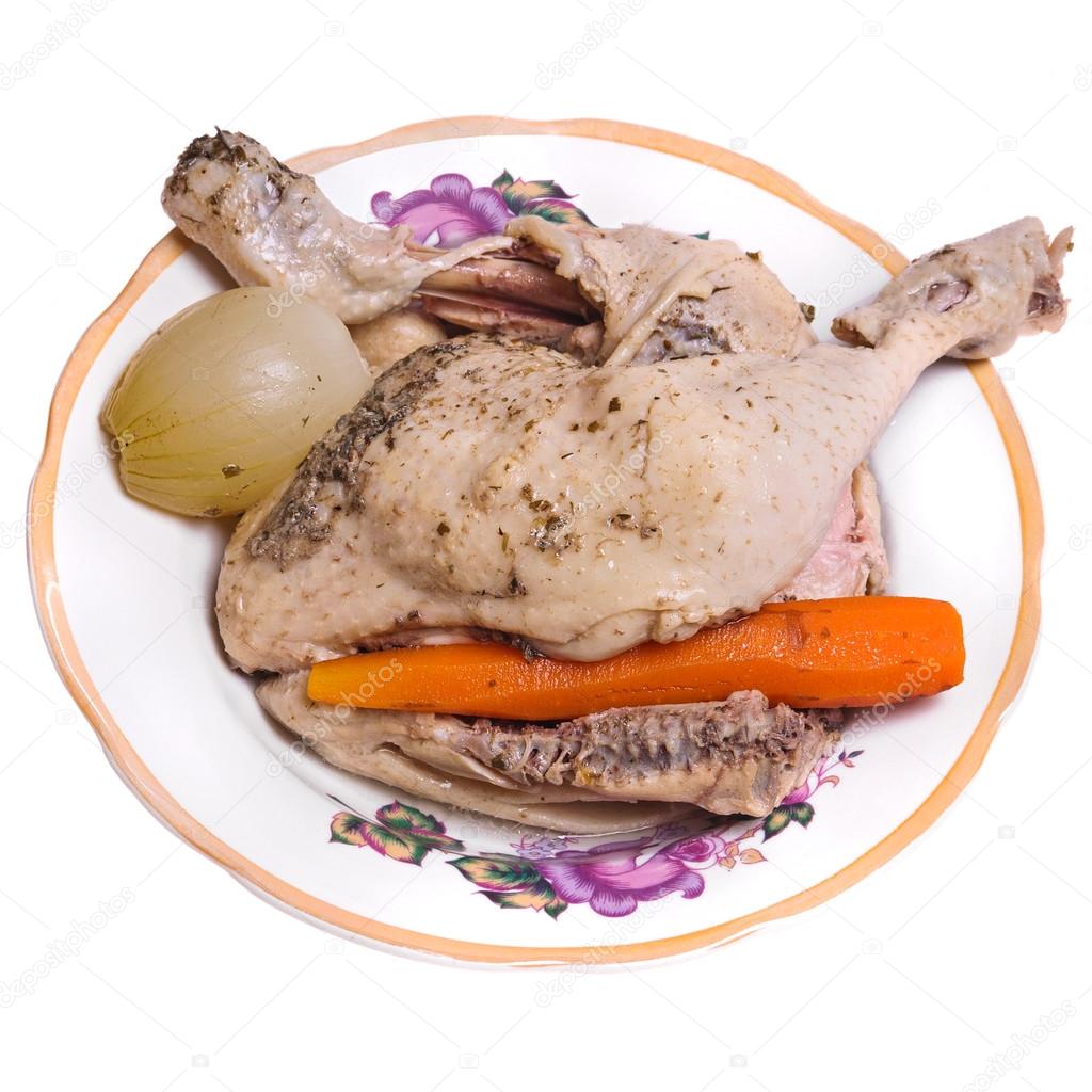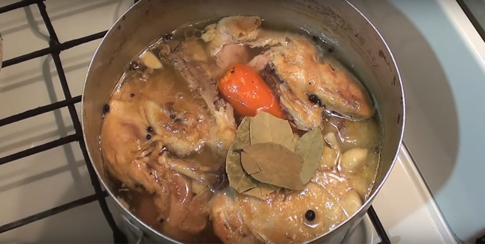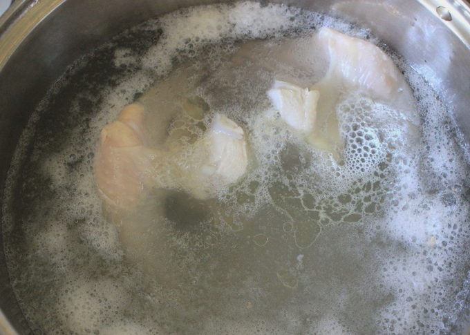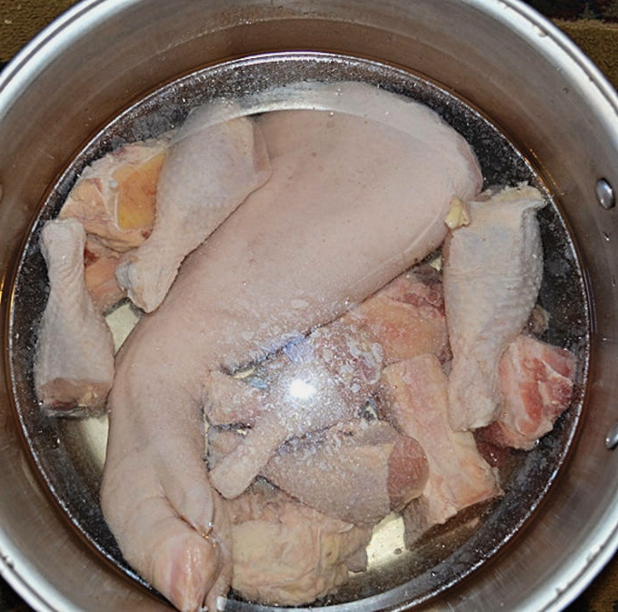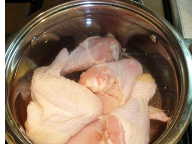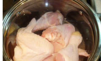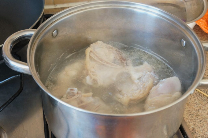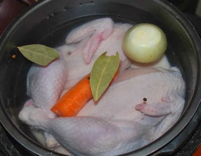 - Giet kippenvlees met water, zet in brand, breng aan de kook, giet het water af, spoel het vlees, vul het opnieuw met water, voeg kruiden toe en zet het weer op het fornuis. Zodra het water kookt, zet u het vuur lager en laat u het vlees onder het deksel 3 uur sudderen.