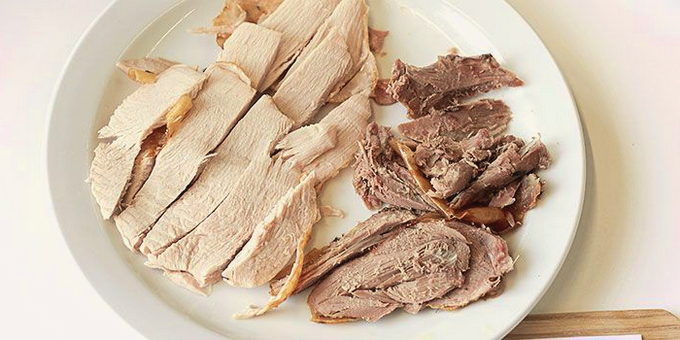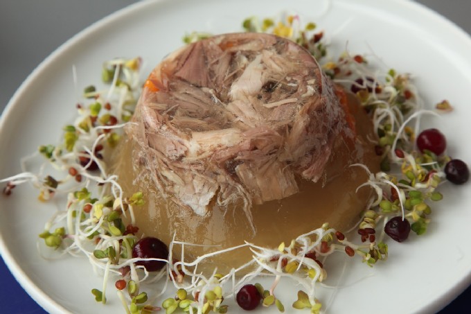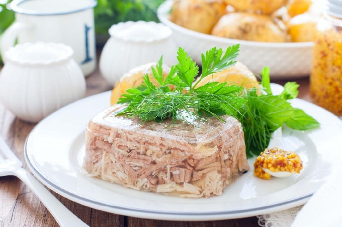 Kalkoen- en kippengelei is lekker en tegelijkertijd niet te calorierijk. Geschikt voor degenen die hun figuur volgen.