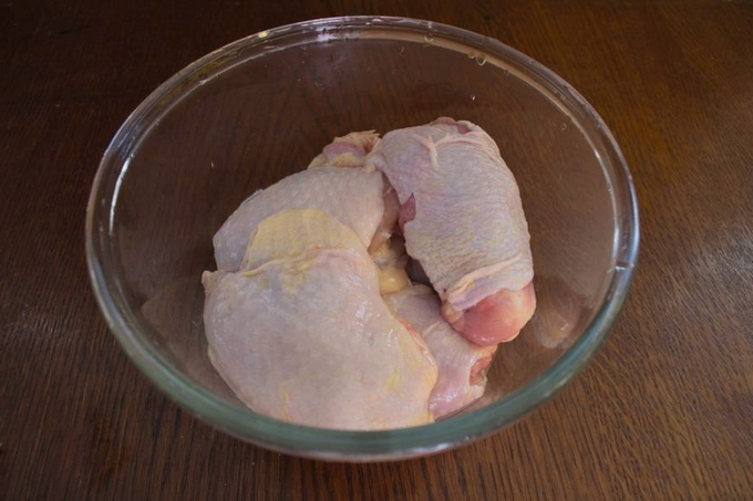 - Je kunt de hele kip nemen of delen ervan. We wassen het vlees onder koud water en verdelen het indien nodig in kleinere delen om het in de multicooker-kom te plaatsen.