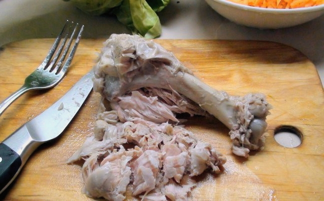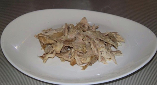 - We halen het vlees eruit en wachten tot het is afgekoeld. Scheid het vlees van de botten en verdeel het in kleine stukjes.