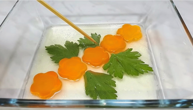 - Leg het kippenvlees in de geleivormpjes, strooi er knoflook over, leg de wortelen mooi neer en vul met bouillon. We zetten de gekoelde vormen in de koelkast en wachten op de volledige stolling. Garneer voor het serveren met takjes verse kruiden.