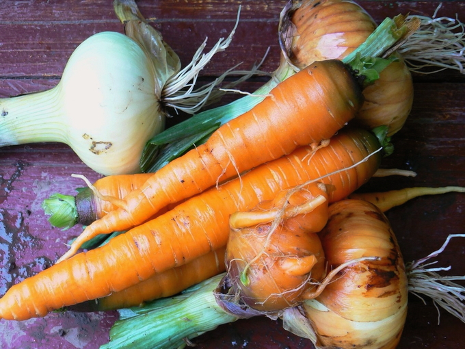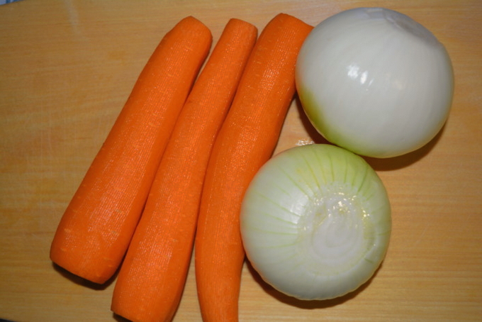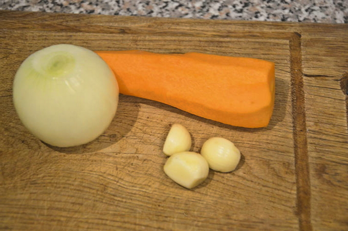 - Schil de uien, wortelen en knoflook.