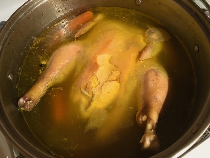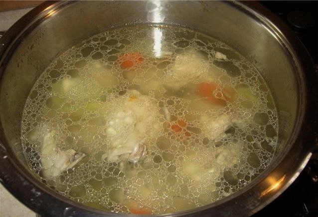 - Je kunt een hele kip nemen en uit elkaar snijden. We verwijderen alle huid en verwijderen ook alle vetlagen, we zullen ze niet gebruiken. We doen het karkas in een pan en vullen het met koud water, zetten het op hoog vuur en brengen aan de kook. Verwijder tijdens het koken het schuim van het oppervlak.