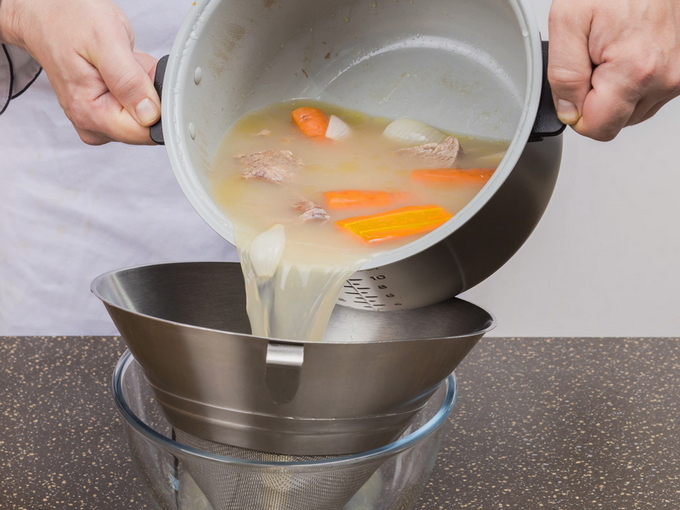 - Haal het vlees uit de pan en laat het afkoelen. Zeef de bouillon.