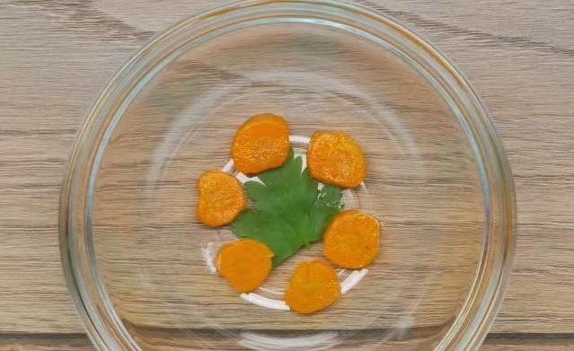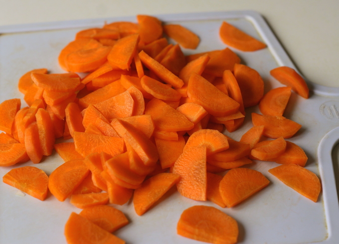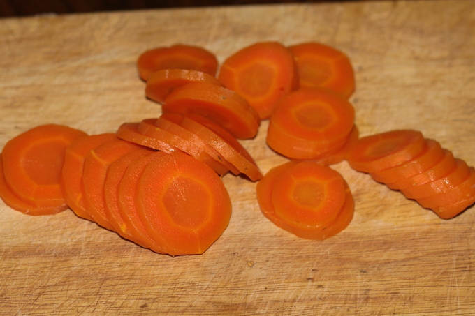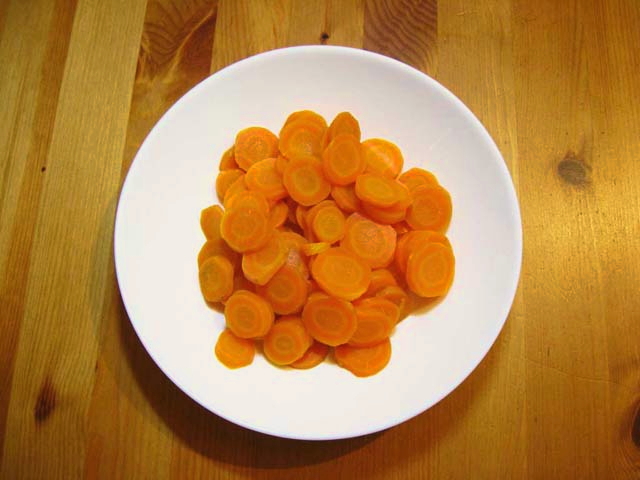 - Snijd de gekookte wortelen in dunne cirkels.
