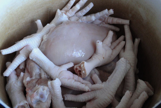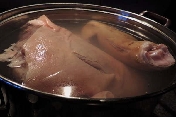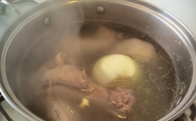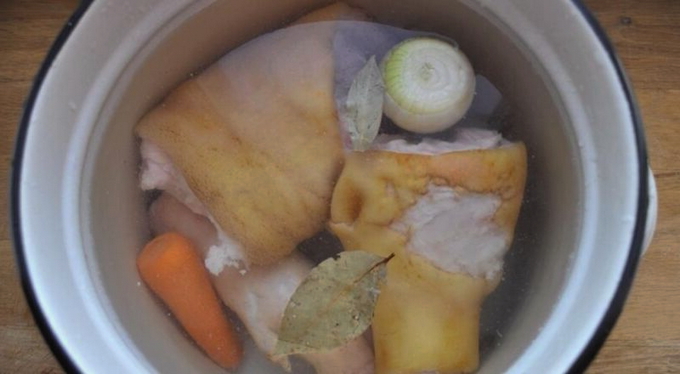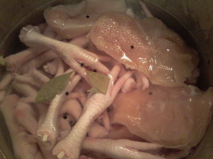 - We wassen de benen onder stromend water, maken ze indien nodig schoon met een mes. We wassen ook de kip, ontdoen hem van de resten van de veren en laten hem samen met de varkenspoten een nacht weken. Giet de volgende dag het water af en spoel het vlees nogmaals af.