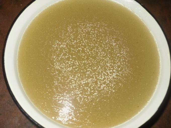 - Hak de knoflook fijn en voeg toe aan de bouillon, meng en laat 15 minuten staan. Vervolgens filteren we de bouillon en verwijderen we overtollig vet van bovenaf met een lepel.