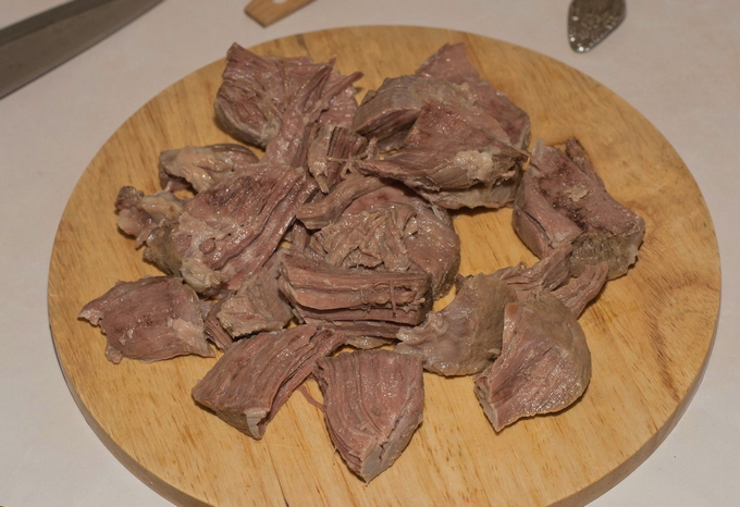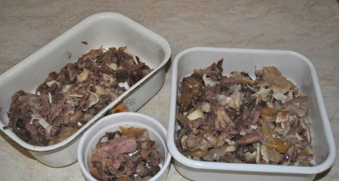- Haal het vlees uit de bouillon, laat het afkoelen. We verwijderen de schil, scheiden het vlees van de botten en verdelen in kleine stukjes. Meng het vlees met gehakte knoflook.
