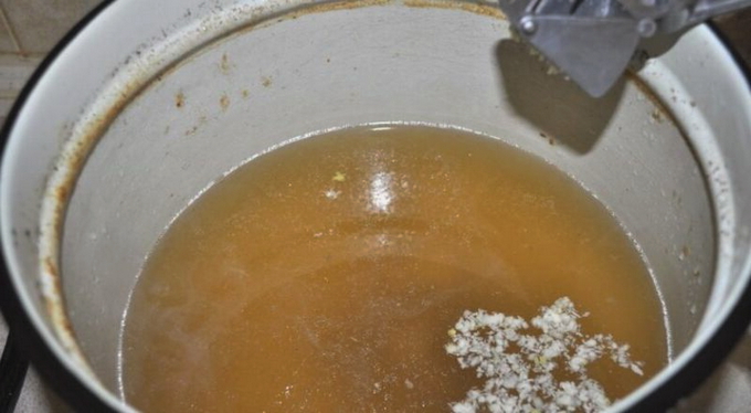- Haal de knoflook door een pers en giet het in de bouillon, laat het 20-30 minuten trekken.