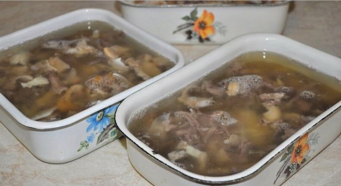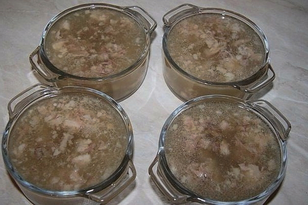- Scheid het vlees van de botten en snijd het in kleine stukjes. We leggen het op de bodem van diepe kommen en vullen het met bouillon. We zetten het geleivlees op een koele plaats waar het moet bevriezen. Voor het opdienen is het noodzakelijk om de witte vetlaag van het oppervlak van het gelei-vlees te verwijderen.