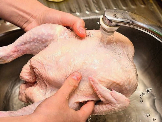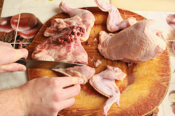 - We bereiden het vlees, spoelen en verwijderen de resten van de veren.