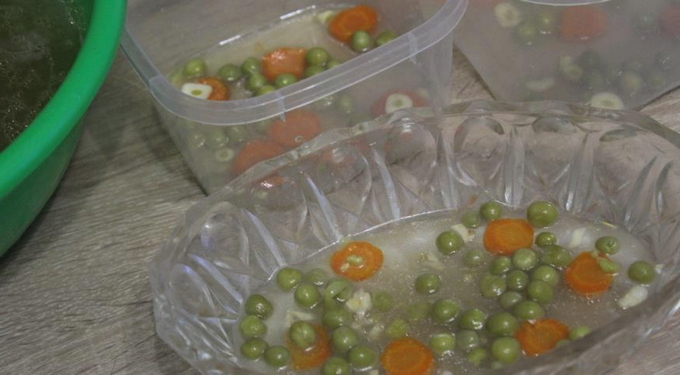 - De schalen met gelei hebben we een nacht in de koelkast gezet. Geleivlees kan uit de vorm worden gehaald, hiervoor houdt u de vorm met geleivlees 1-2 minuten in heet water en draait u de kom om; erwten uit blik en verse kruiden kunnen worden gebruikt om het gerecht te versieren.