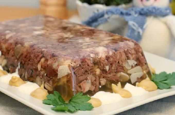- Maak mallen voor het geleivlees, leg het vlees erin en vul ze met bouillon, laat de schaal op een koude plaats staan zodat het geleivlees bevriest. Mierikswortel of mosterd is erg goed voor geleivlees.