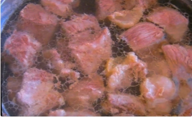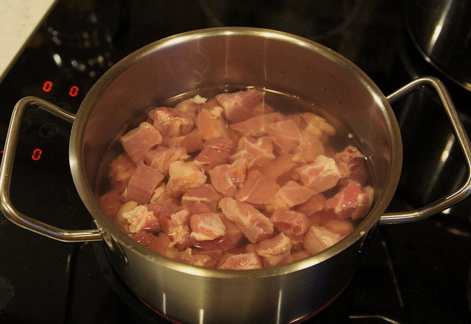 - We wassen het vlees goed, maken het schoon, verdelen het in ongeveer gelijke stukken, doen het in een grote pan, vullen het met koud water en brengen aan de kook, koken 5 minuten, waarbij we constant het schuim verwijderen met een lepel.