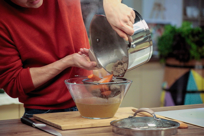 - We halen het vlees en de wortelen eruit en laten ze afkoelen. Zeef de bouillon.