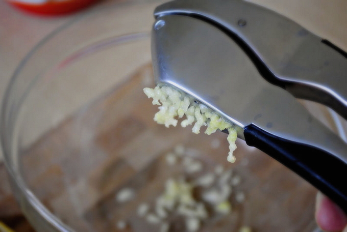 - Pel de knoflook, maal hem met een pers.