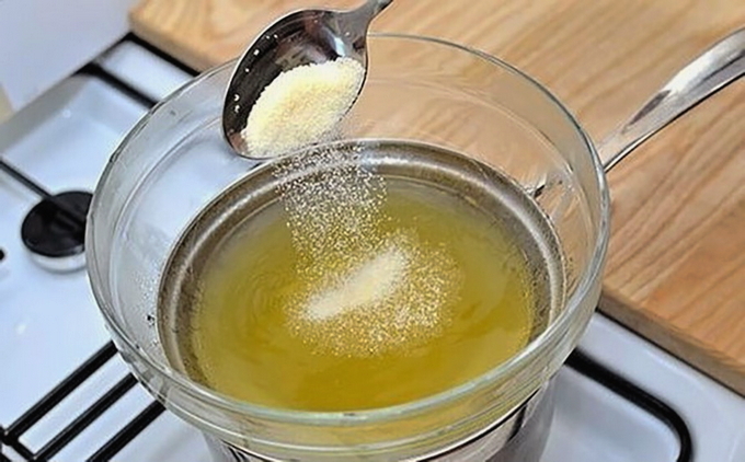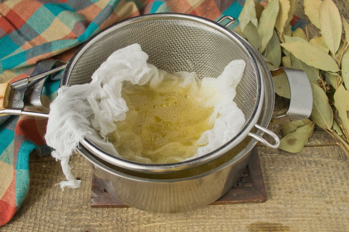 Nadat de kip gaar is, halen we hem uit de pan, filteren we de bouillon. Verdun de gelatine met een kleine hoeveelheid water en giet deze bij de bouillon.