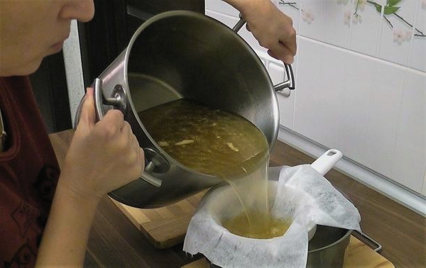 - Zeef de bouillon door een fijne zeef of kaasdoek.