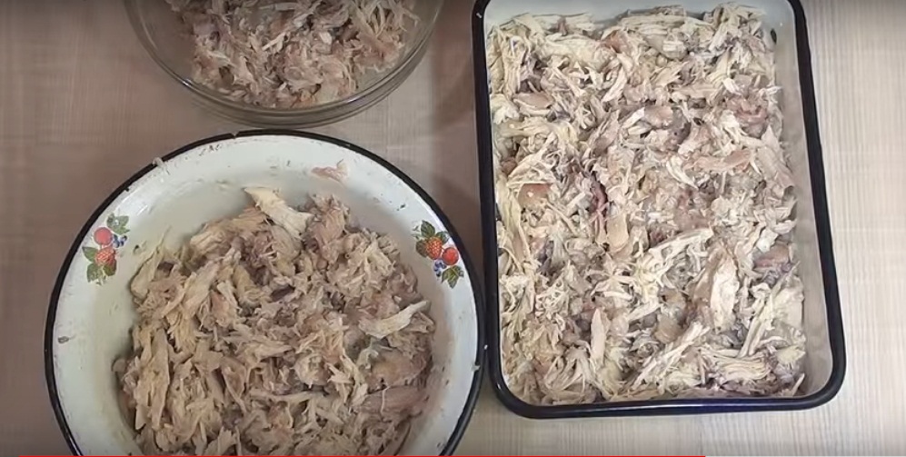 - Als alle ingrediënten klaar zijn, haal je de pan van het vuur en haal je de kip voorzichtig uit de bouillon om jezelf niet te verbranden. Nadat het is afgekoeld, scheidt u het vlees van de botten en snijdt u het in kleine blokjes.