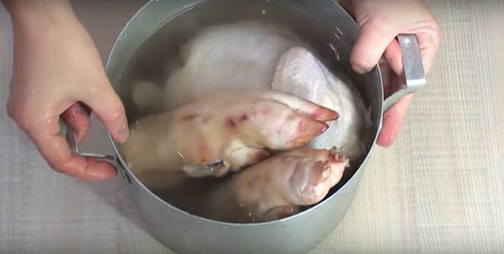 - Voordat u gelei-vlees van kippenpoten gaat koken, moet u deze zelfde poten wassen en 10 minuten kokend water gieten, dit is nodig zodat de huid op de poten gestoomd is en gemakkelijk kan worden afgepeld. Nadat de benen goed zijn gestoomd, maakt u ze schoon (verwijder de huid en knip de plaats af waar de nagel op de vingers zat).
