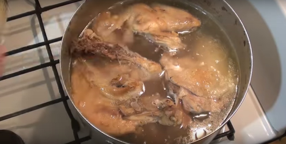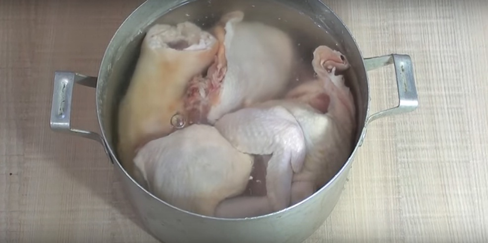 - Spoel de kip af en voeg toe aan de pan aan de varkenskop als er ongeveer 4 uur zijn verstreken vanaf het begin van het koken. Ook moet je op dit moment laurierblaadjes en peperkorrels aan de bouillon toevoegen.