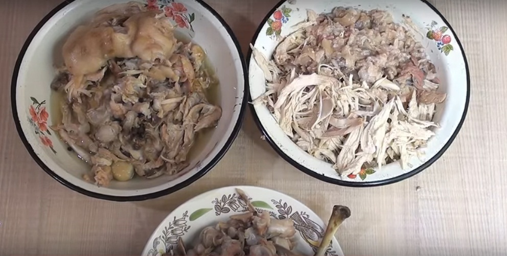 - Zet na 6 uur het vuur uit en verwijder voorzichtig het varkensvlees en de kip. Als het vlees is afgekoeld, scheidt u het voorzichtig van de botten (u moet ook het vel, de hersenen en de vetste delen van het varkensvlees verwijderen). Het vlees moet fijn genoeg worden gesneden.