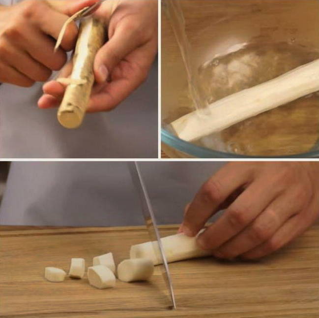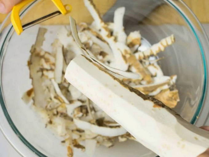 - Schil en was de mierikswortelwortel. Om overtollige bitterheid kwijt te raken, giet je een paar minuten kokend water over de mierikswortel.