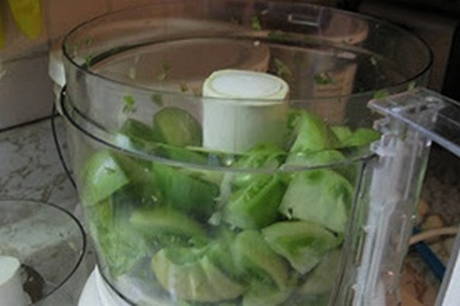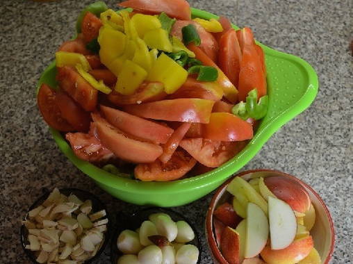 - Was de tomaten en paprika's en snijd ze in kleine partjes. Was de appels, snij het klokhuis met zaadjes en snij ook. Pel de knoflook. Snijd de bovenste laag van de mierikswortelwortel af, was en hak hem fijn.