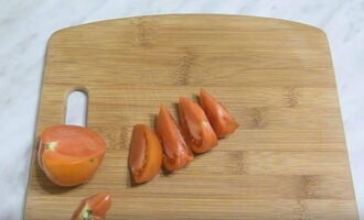 - Was de tomaten, snij het steelaanzetstuk doormidden en snijd de groenten in vieren.