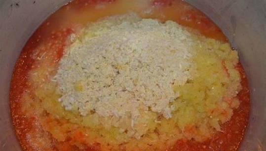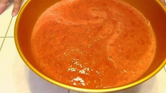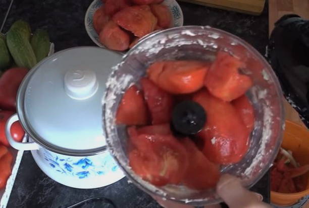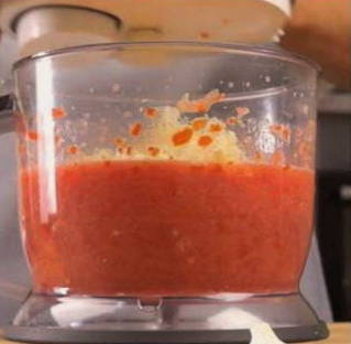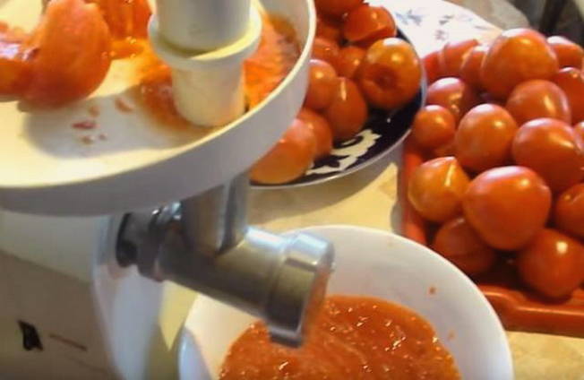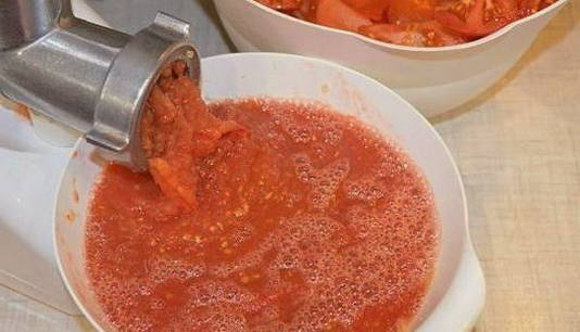 - Wrijf de tomaten en paprika's door een vleesmolen.