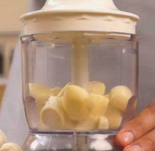 - Pel de knoflook. Snijd de mierikswortel in kleine stukjes en hak deze samen met de knoflook in een blender.