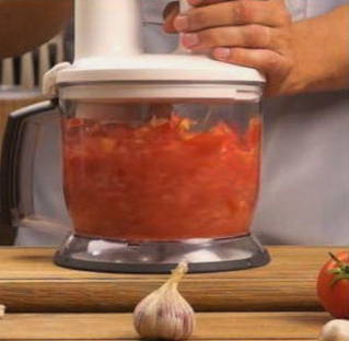 - Was de tomaten, snijd de steel af, snij in vieren en maal de groenten in een blender.