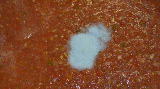 - Doe alle gehakte ingrediënten in een pan, voeg suiker en zout toe. Breng de stront aan de kook, zet het vuur lager en laat 5-7 minuten sudderen.