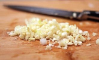 - Hak de gepelde knoflook fijn, hak verse kruiden op dezelfde manier fijn en doe alles in een zak.