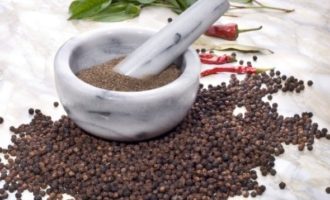 Peper, zwart en piment, voor het koken van de komkommers, vermaal ze in een vijzel of koffiemolen zodat hun aroma goed naar voren komt.