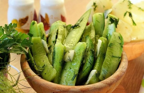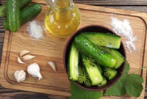 Krokante komkommers met knoflook, dille en zonnebloemolie