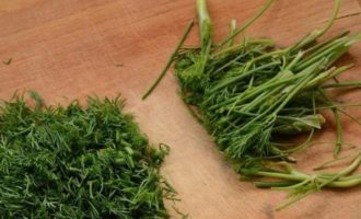 - Spoel groene dille, droog af met een servet, hak fijn en breng over naar groenten.