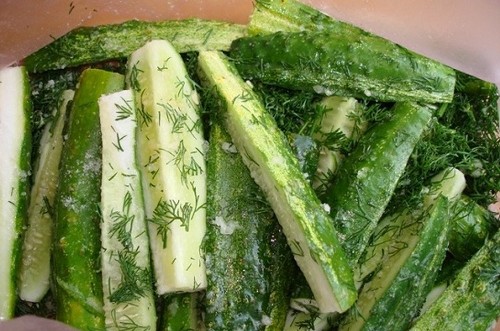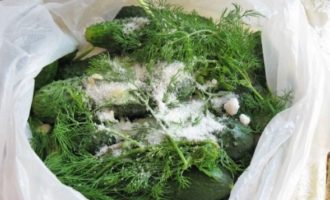 Doe gehakte komkommers in zakken (neem twee zakken), doe er gehakte dille en knoflook op en bestrooi met gemalen peper, zout en suiker. Bind de zakken stevig vast, laat er wat lucht in, en schud dan een paar keer krachtig zodat de komkommers goed mengen met de kruiden. Koel de komkommers vervolgens in de koelkast en je kunt eten.