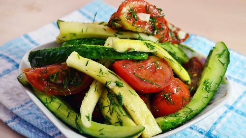 - Een eenvoudig en snel recept voor komkommers met knoflook, dille, courgette en tomaten