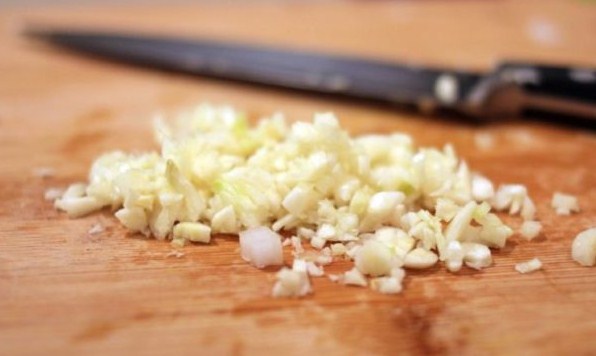 - Snijd de gepelde teentjes knoflook in een knoflookkom.