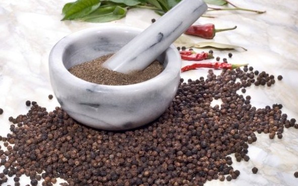 Peper, zwart en piment, voor het koken van de komkommers, vermaal ze in een vijzel of koffiemolen zodat hun aroma goed naar voren komt.