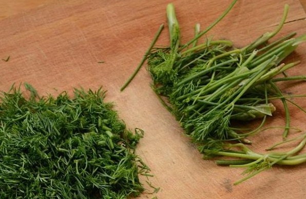 - Spoel groene dille, droog af met een servet, hak fijn en breng over naar groenten.