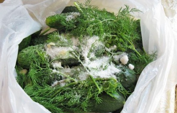 Doe gehakte komkommers in zakken (neem twee zakken), doe er gehakte dille en knoflook op en bestrooi met gemalen peper, zout en suiker. Bind de zakken stevig vast, laat er wat lucht in, en schud dan een paar keer krachtig zodat de komkommers goed mengen met de kruiden. Koel de komkommers vervolgens in de koelkast en je kunt eten.