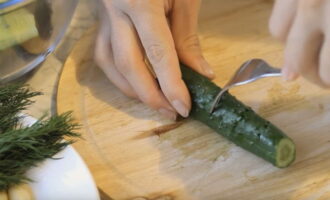 - Een bosje dille moet grondig worden afgespoeld onder stromend water en gedroogd. Dan moet je de dillegroenten fijn hakken met een scherp mes.Snijd de komkommerpeuken af en prik met een vork in het fruit. Deze fase is belangrijk om ervoor te zorgen dat de komkommers de marinade actiever opnemen en ook hun eigen sap laten. Anders kunt u de komkommers eenvoudig in de lengte in vieren snijden.
