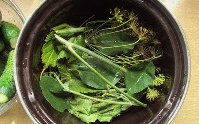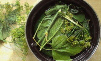 - Bekleed de bodem van de pan met de helft van de kruiden, voeg een beetje knoflook toe. Snijd vervolgens de peuken van de komkommers af en prik in elke komkommer met een vork of een tandenstoker zodat ze de augurk sneller oppakken.