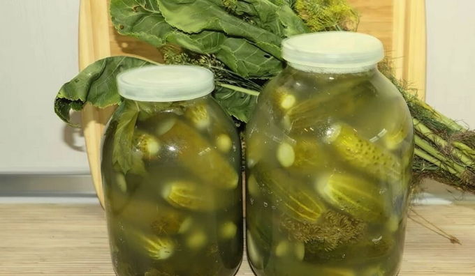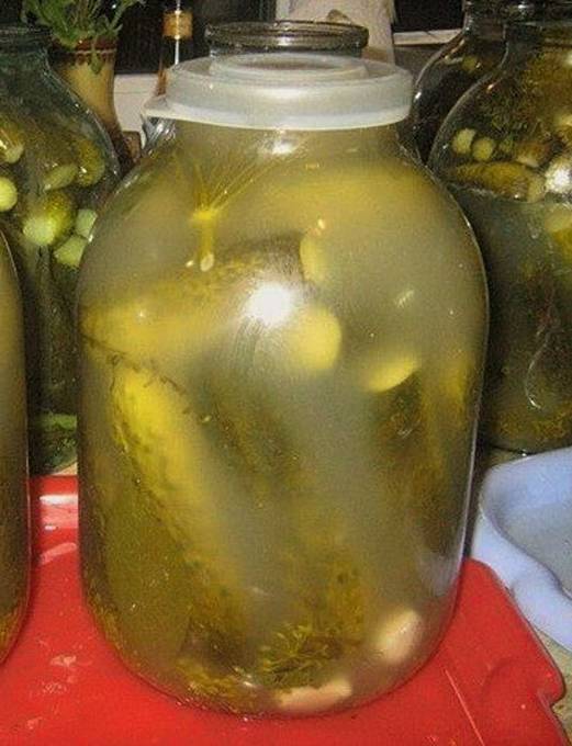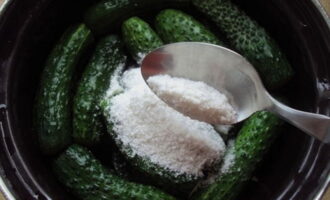 - Bereiding van de pekel: verdun zout en kristalsuiker in schoon drinkwater. Plaats de container met de pekel op het fornuis en breng de oplossing aan de kook. Giet een bak komkommers met kokende pekel helemaal naar boven. Sluit de container met komkommers met een deksel en laat een dag op kamertemperatuur staan, om te beitsen.