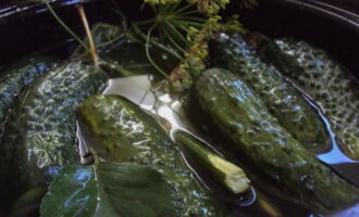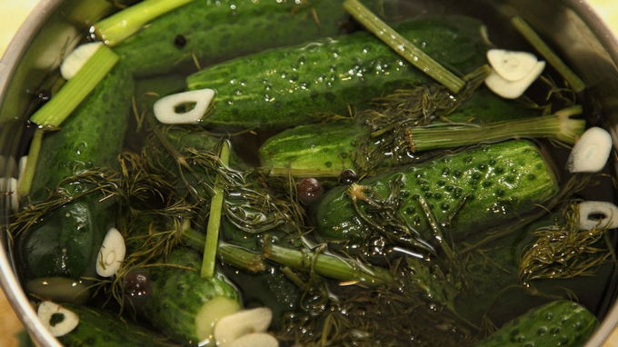 Giet de komkommers met koude pekel. Verwarm hiervoor 0,75 liter water en los hierin zout op. Combineer het warme deel met koud water, laat afkoelen en giet over de komkommers. Voeg vervolgens de overige kruiden toe. Komkommers moeten tien uur bij kamertemperatuur worden toegediend en vervolgens een dag in de koelkast.