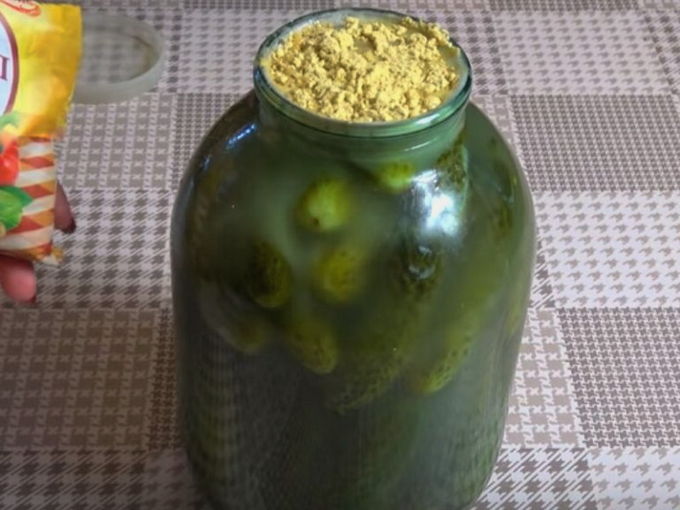 - Pel de knoflook van de schil, doe de komkommers in een kom brood, druk ze stevig aan en leg de knoflookteentjes tussen de komkommers. Los grof zout grondig op in koud drinkwater en giet de pekel in een bak met komkommers. Bedek de bovenkant van de pot met mosterdpoeder.